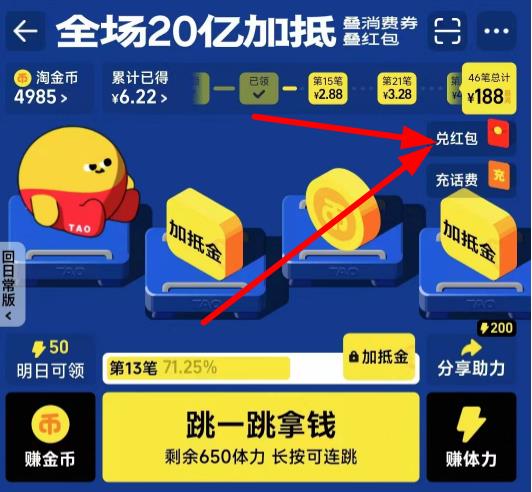 淘金币 右上角兑红包 -> 兑换36-16.8红包 (找不到,向左滑动),需要淘金币1680个 做做任务就有了